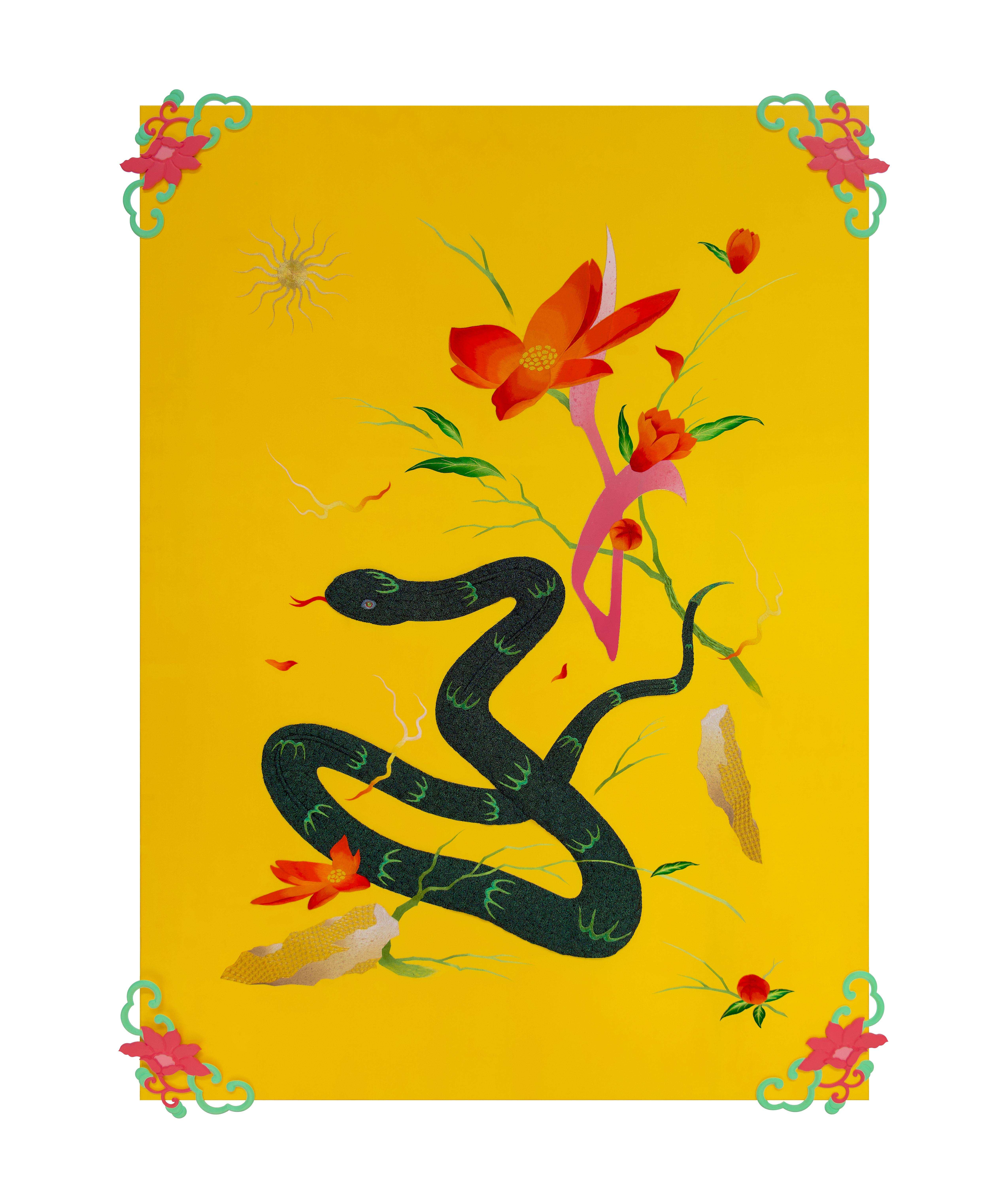 Through this work, I wanted to tell a story about Chaozhou. In the vibrant Yingge Dance, the lead figure “Shi Qian” symbolizes the Chaozhou people’s spirit of exploration. I deconstructed the character “迁” (Qian, meaning migration or movement*), weaving it with serpent and floral imagery to express transformation, renewal, and the timeless drive to explore.